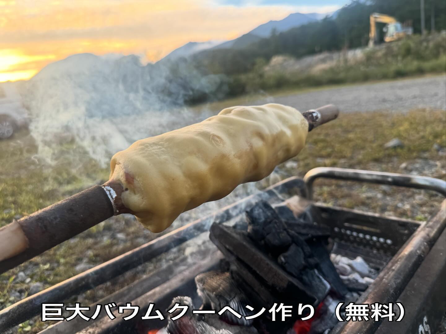 生地を塗って焚き火で棒をクルクルして大きな大きなバウムクーヘンを作りましょう!